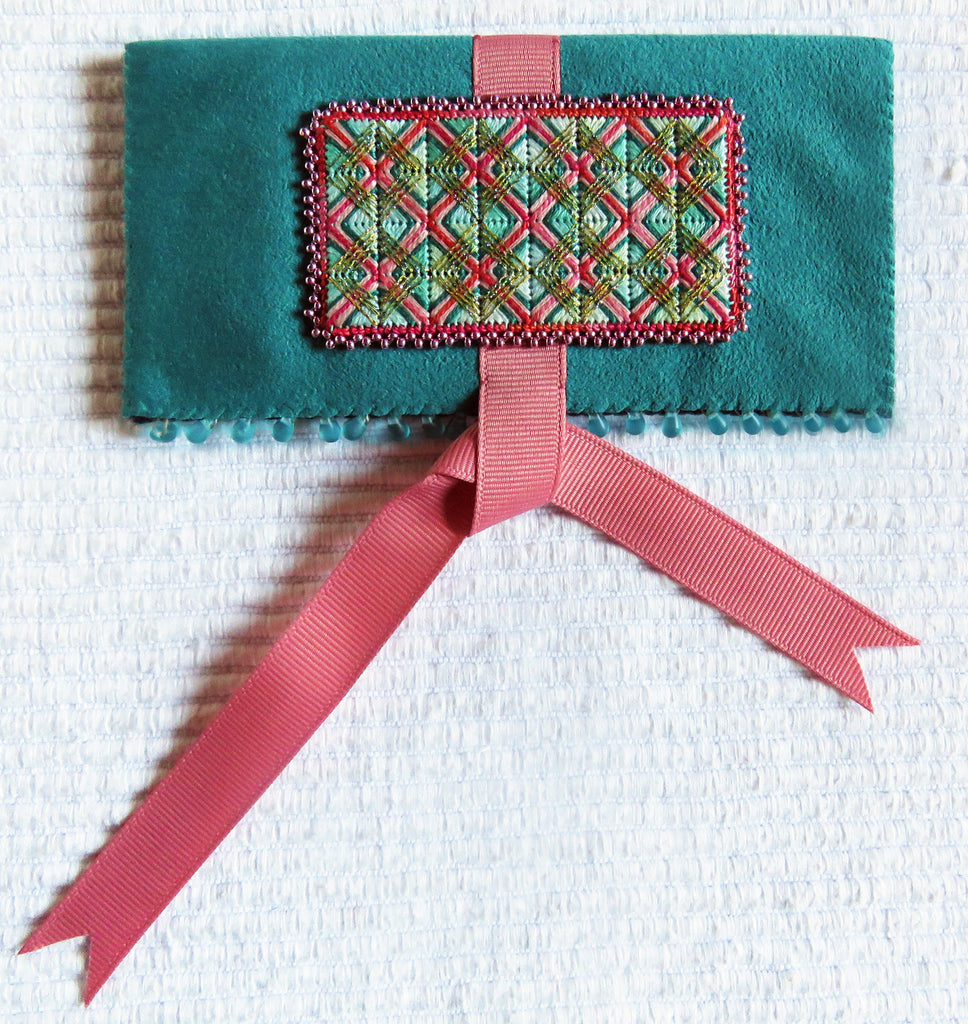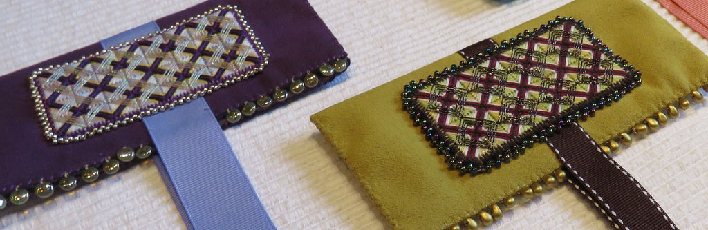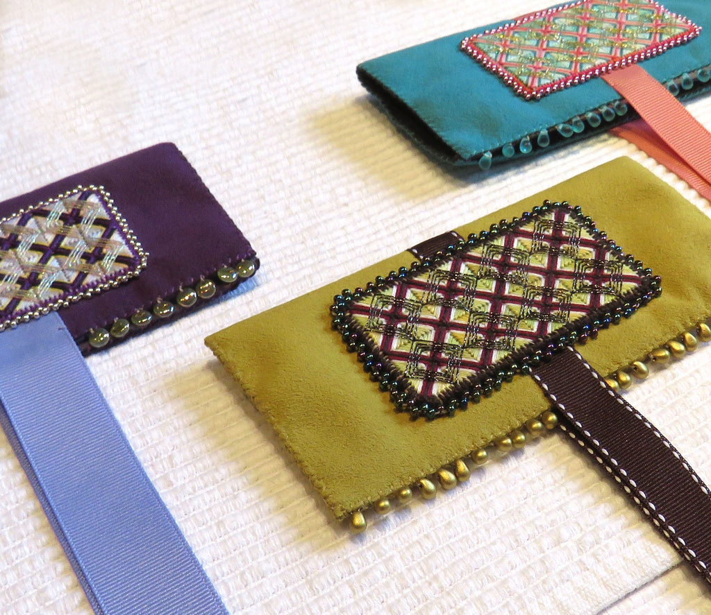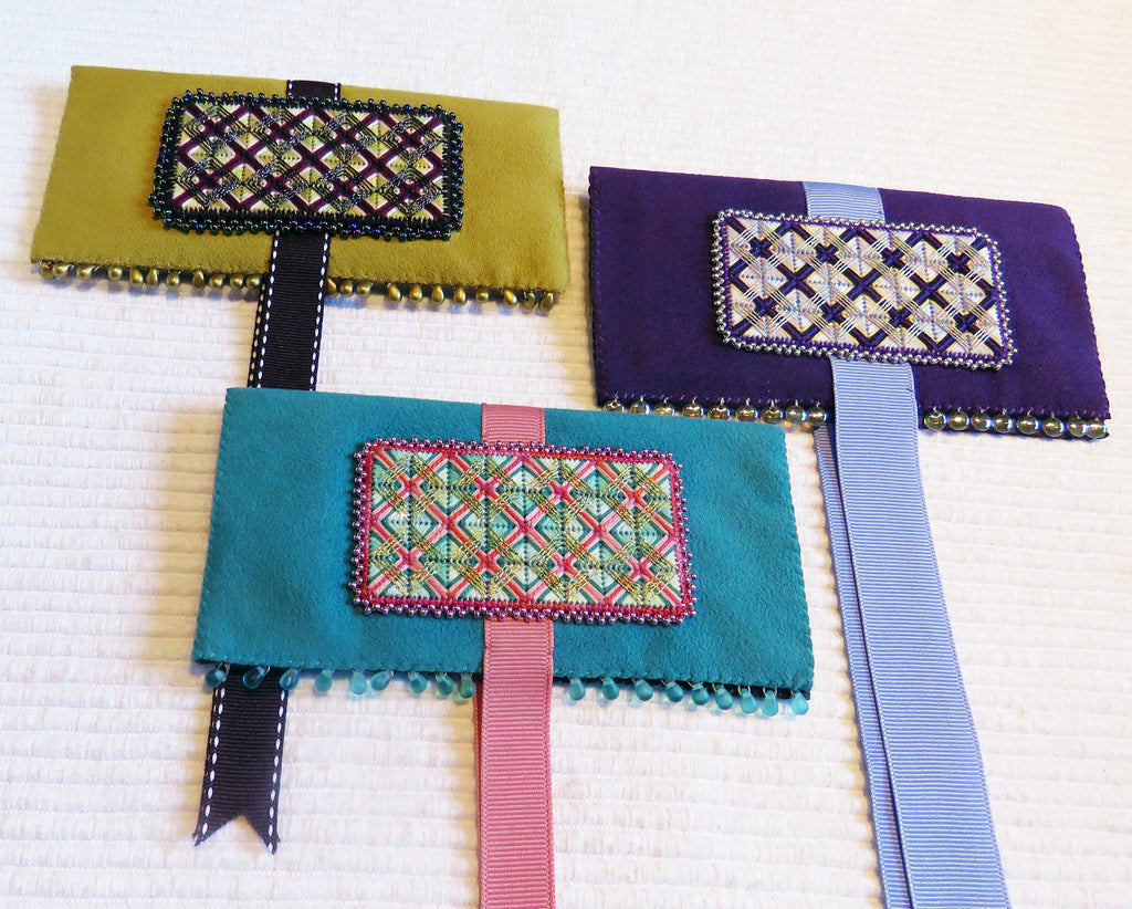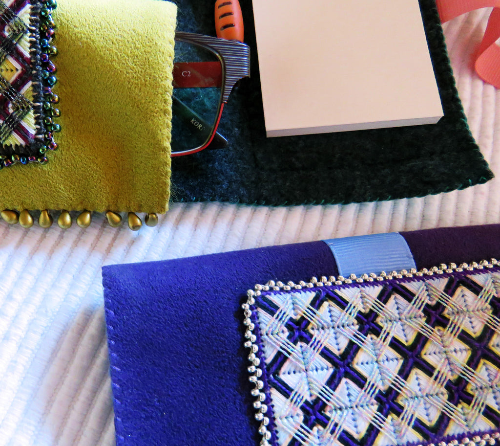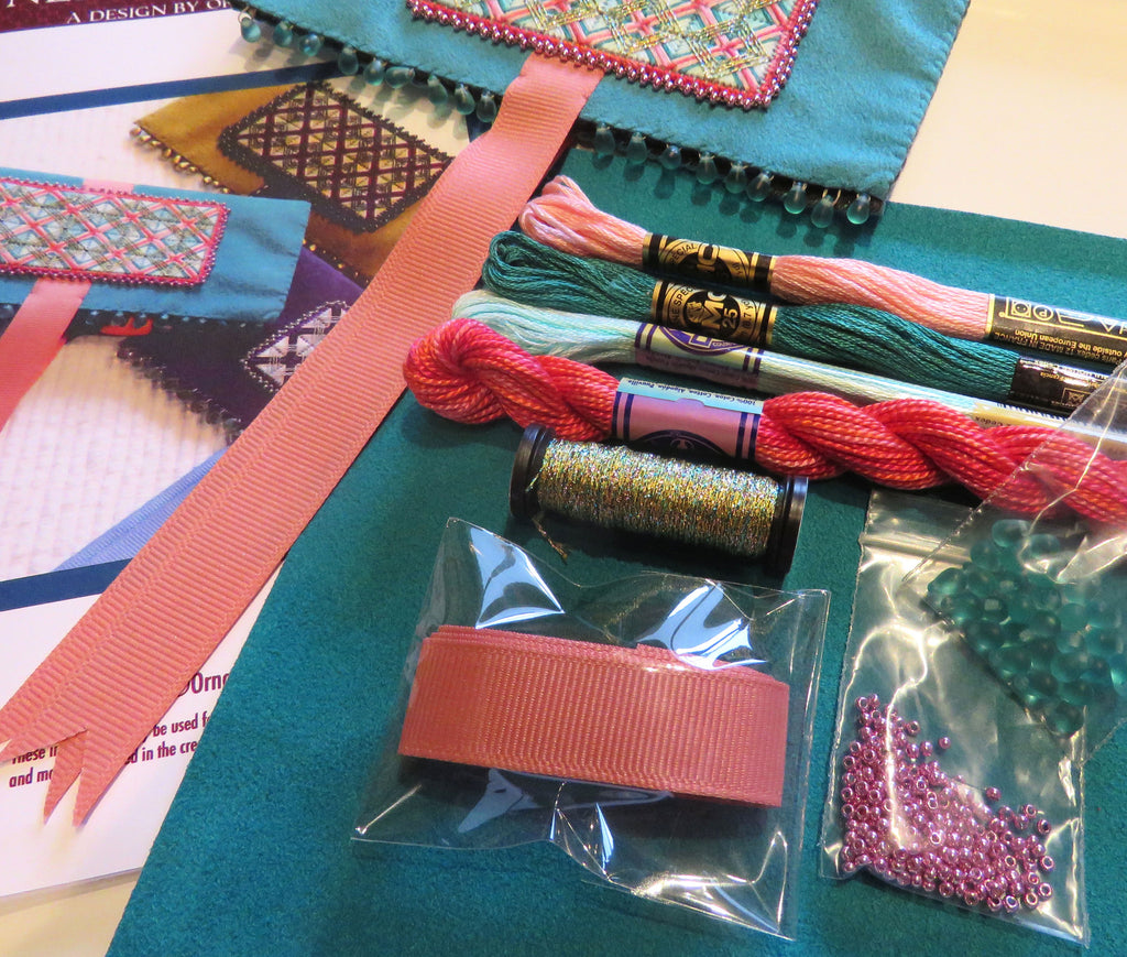 This lovely kit can be made into an eye glass case, a needle case or a notebook case. It's a small, quick stitch needlepoint piece mounted on Ultrasuede. In addition your kit includes Ultrasuede, felt, and precise instructions on how to put together one of these great personal accessories. For the notebook case you will get a matching notebook and Adorn pencil to fit into the case. A complete kit, including canvas and needles is very reasonably priced, making it a wonderful gift as well!