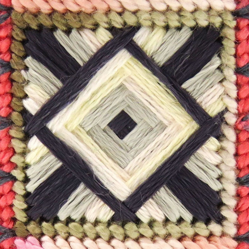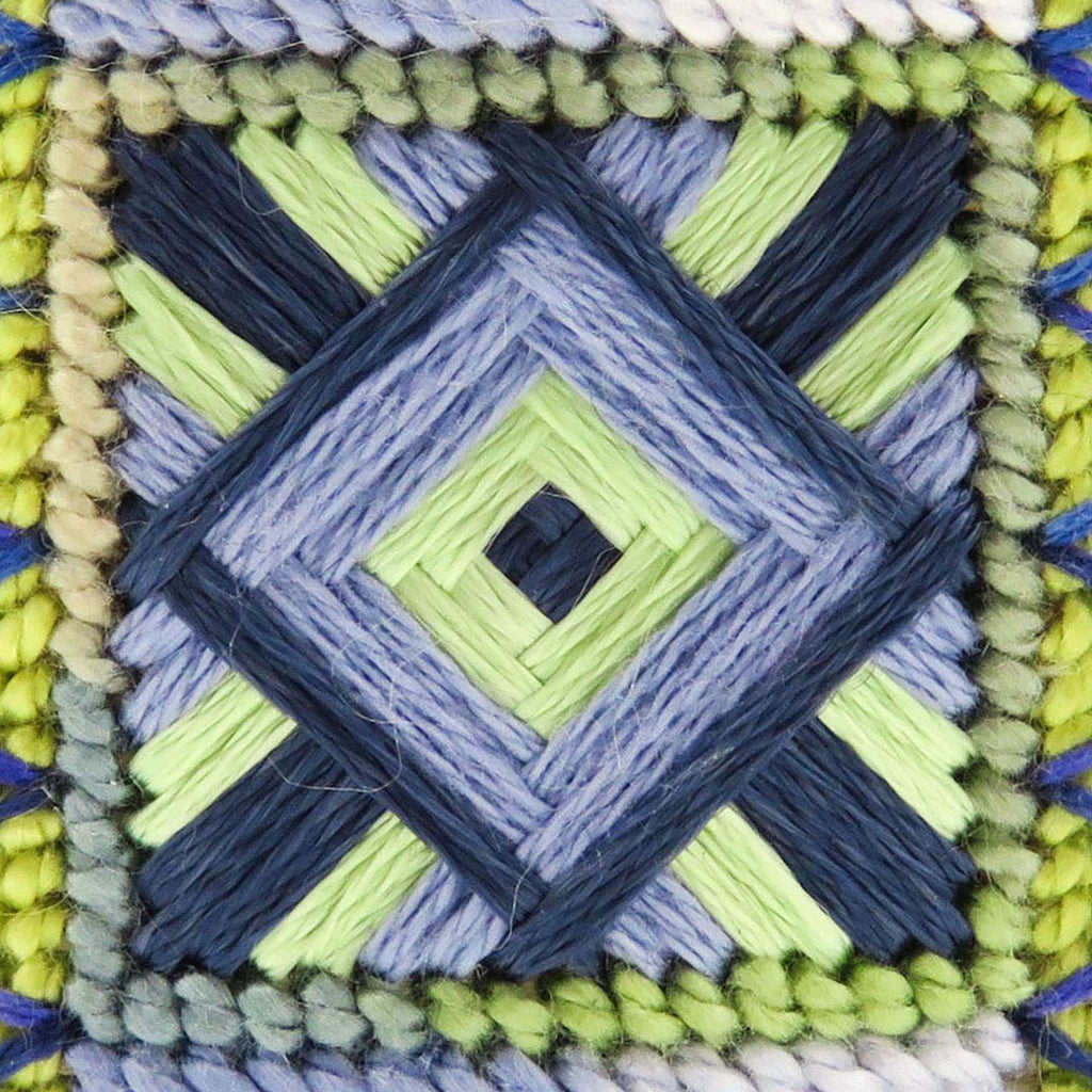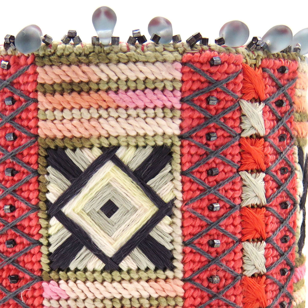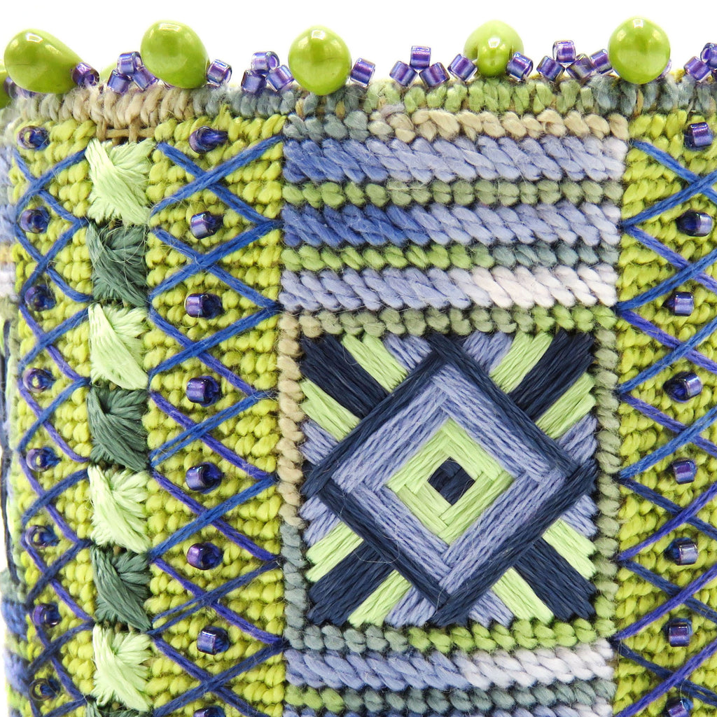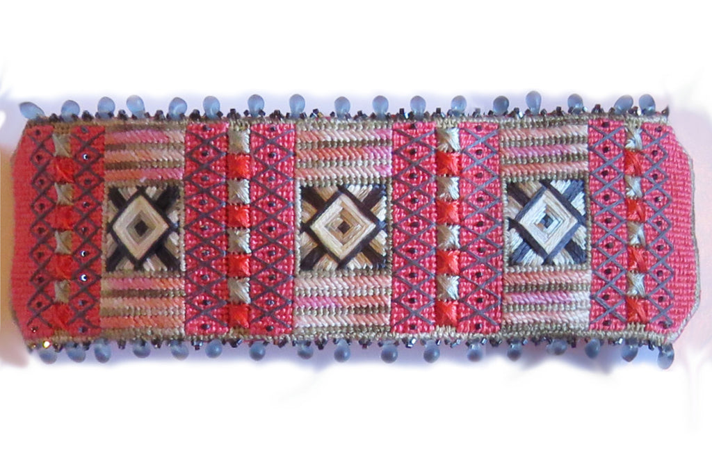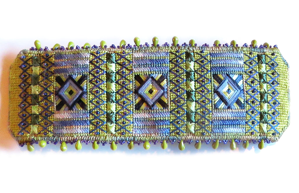 The Shimmering Jewels Cuff is a beautiful project for any level stitcher. Two pattern repeat themselves, with the addition of beads and overlays, creating an elegant piece of jewelry. The additional edge beading with teardrop glass beads brings this piece to another level of sophistication. You will love this project as a carry-around-with-you project, one that you can finish in no time. The instructions come with the detailed steps of how to finish your needlepoint piece as a cuff and how to bead the edges of the cuff to give that final bit of elegance.