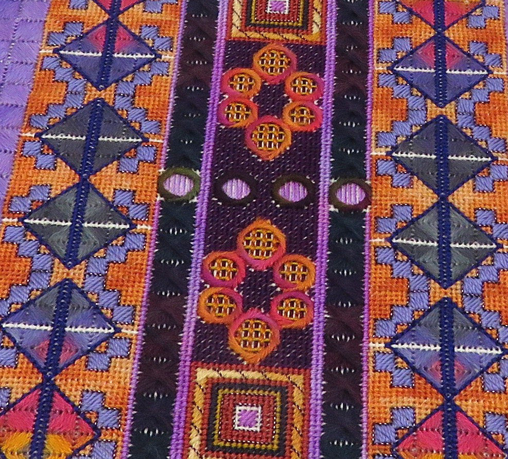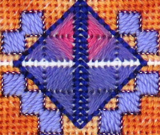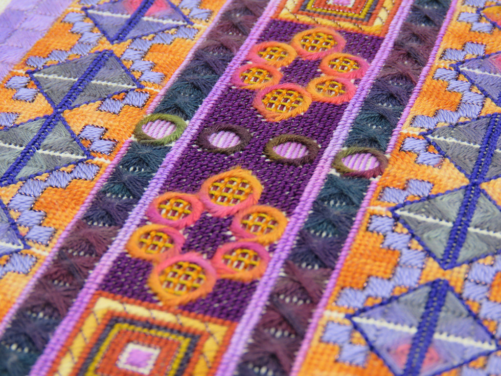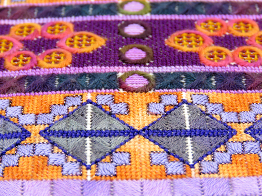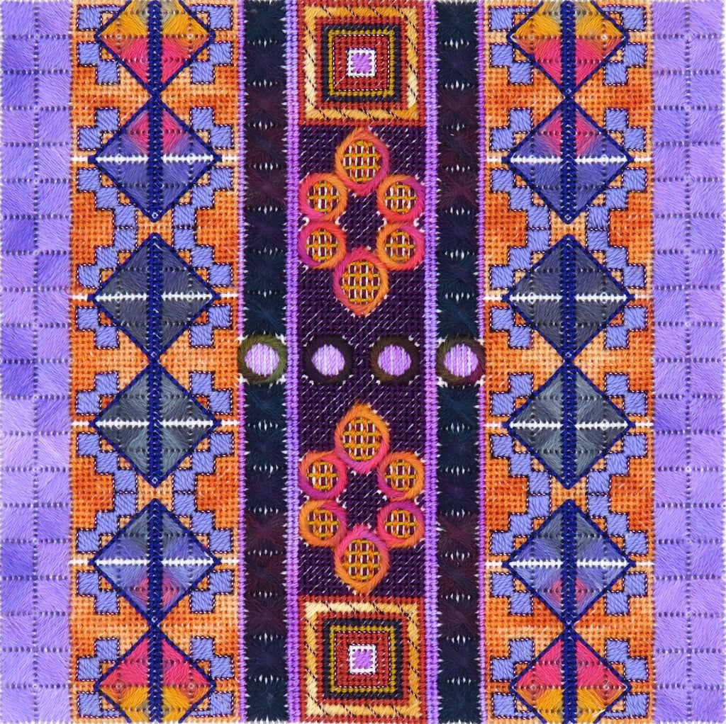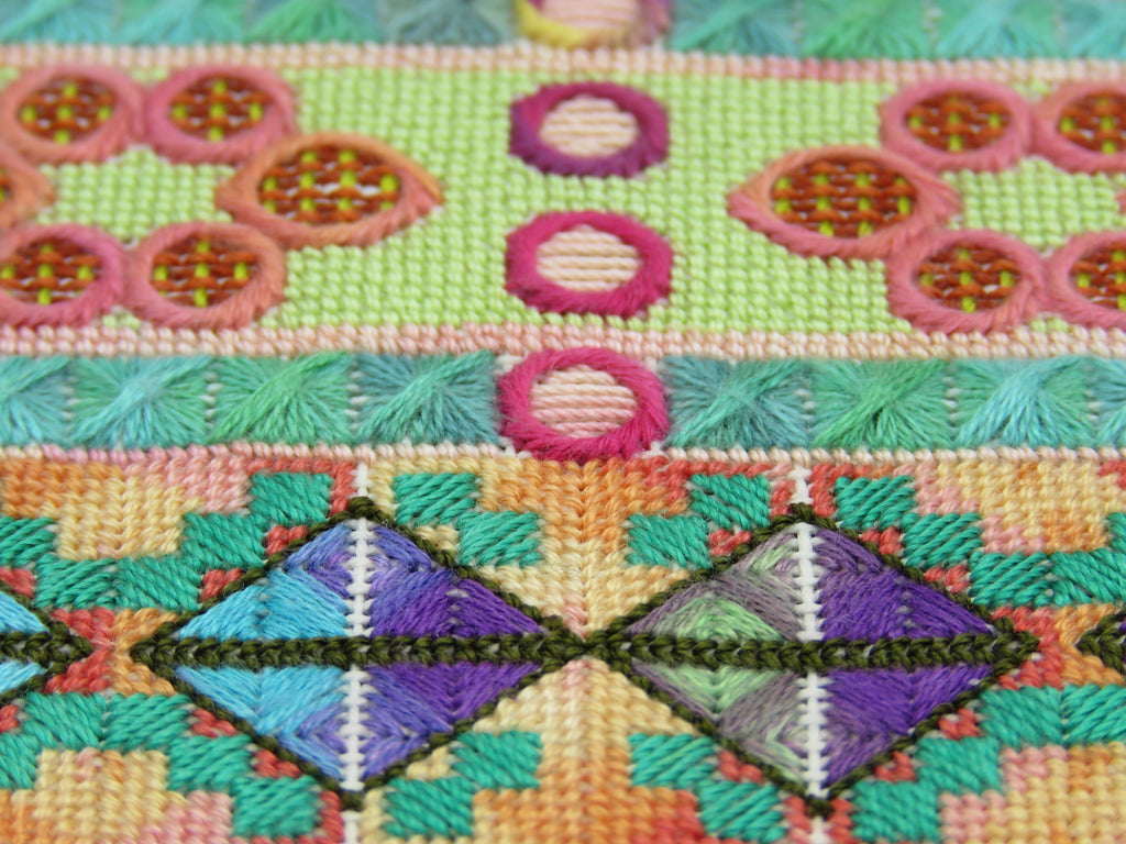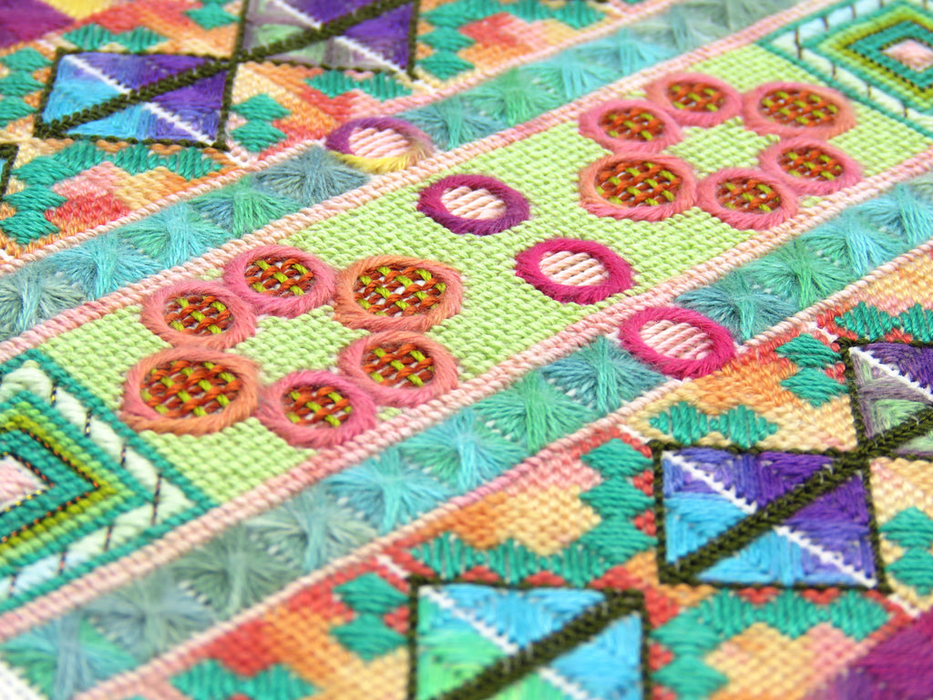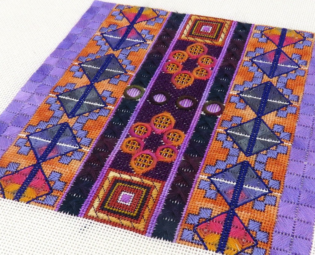 A beautiful little study on Congress Cloth with exciting colors and delicate silk fibers. Down the Line is inspired by the fantastic organization my daughter is an ambassador to, which encourages and offers assistance to young aspiring tennis players. The colors and shapes bounce off the canvas, symbolic of the wonderful sport. Using the play of overdye and variegated threads the canvas comes alive.