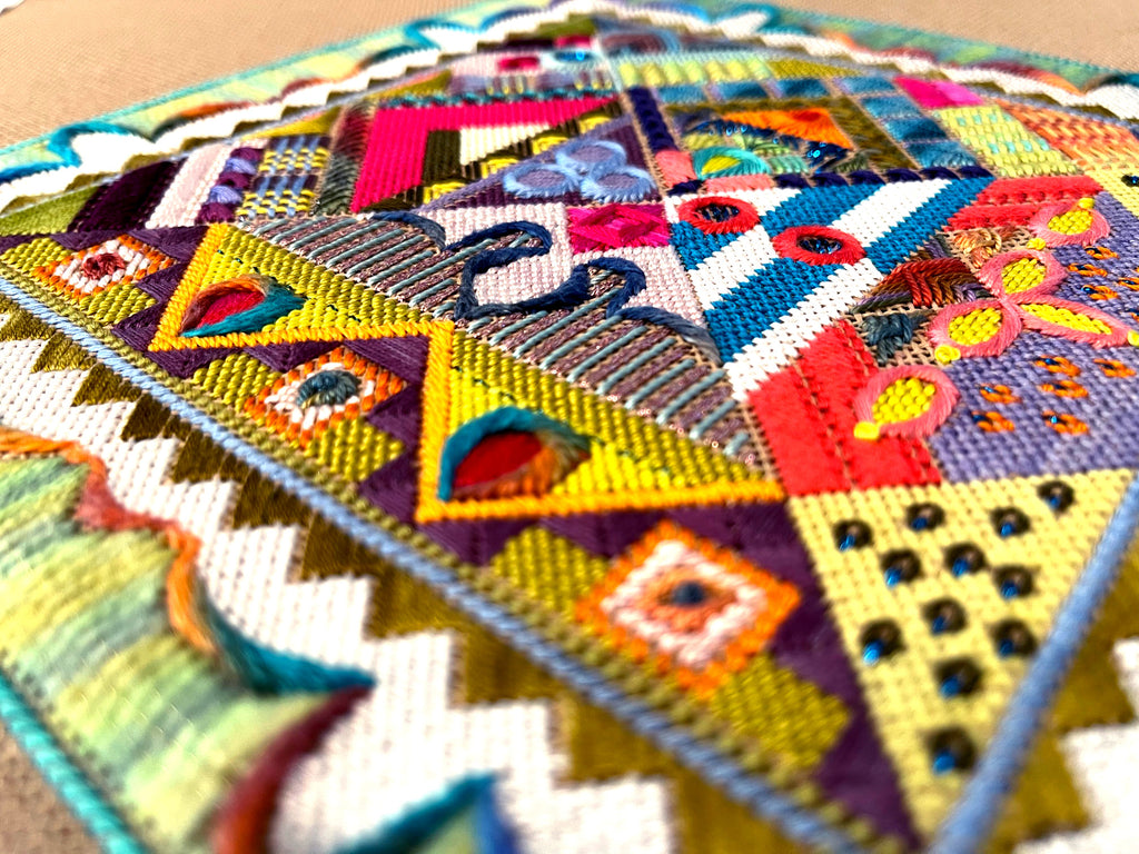 The project consists of four triangles that come together to form a diamond. The diamond is then wrapped in a beautiful frame of silk crescent stitches “dancing” around its edges. In each of the four triangles, you will find interesting stitches that will challenge you. There are Crescents, Jessicas, weaving, couching, laying of threads, just to name a few of the skills learned in the class. With Orna’s guidance, each of these stitches will be broken down and dissected so that students will learn the tricks to bringing out the best in each stitch. You will learn tips that you will take on with you to any projects you stitch in the future.