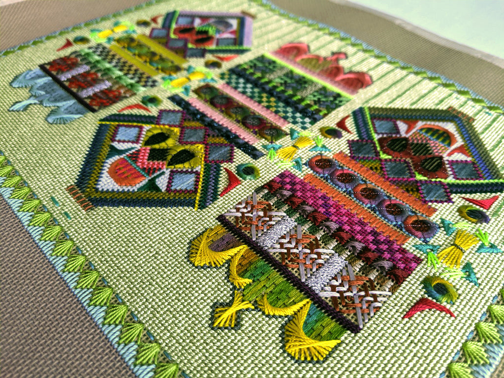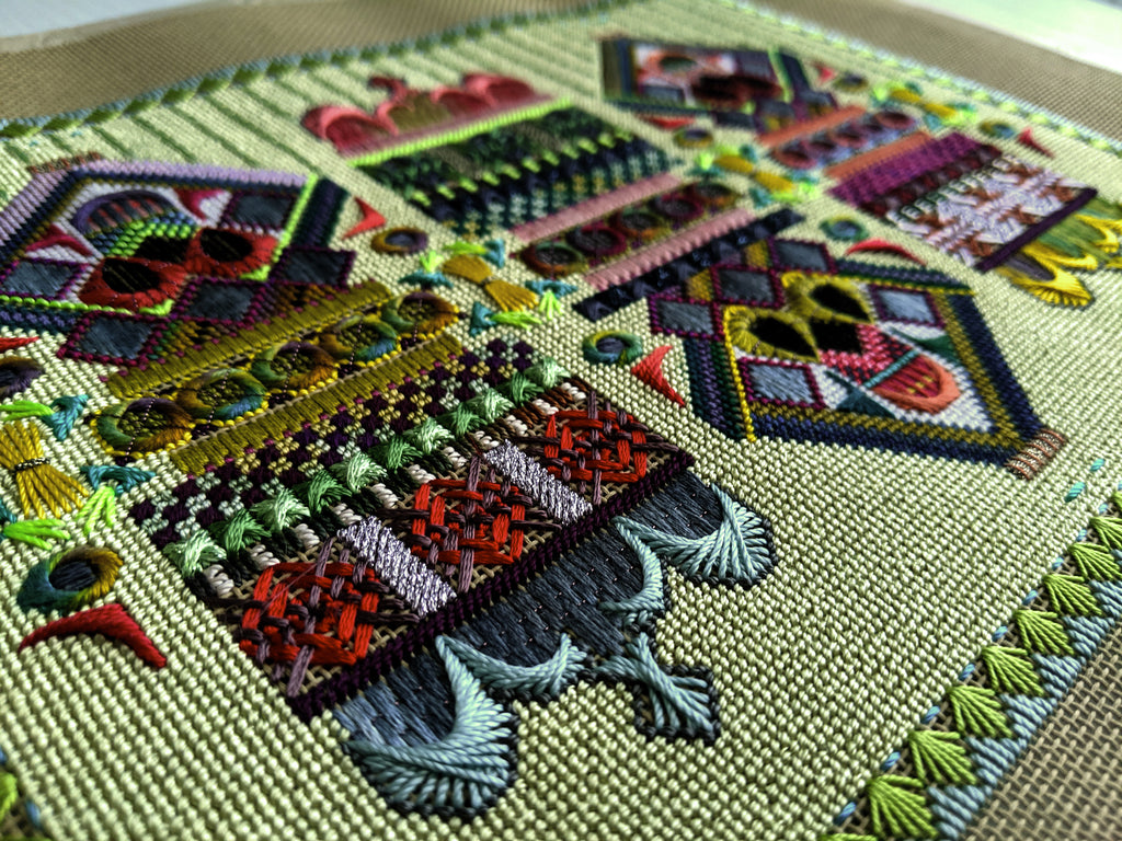 Nomi’s Dragons brings to life creatures from a magical world with the use of complex stitches and intriguing threads; woven ribbons, laid overdyes, smooth crescents and layered Jessicas. With Orna’s guidance, each of these stitches will be broken down and dissected so that students will learn the tricks to bringing out the best in each stitch.  You will learn tips that you will take on with you to any projects you stitch in the future.
