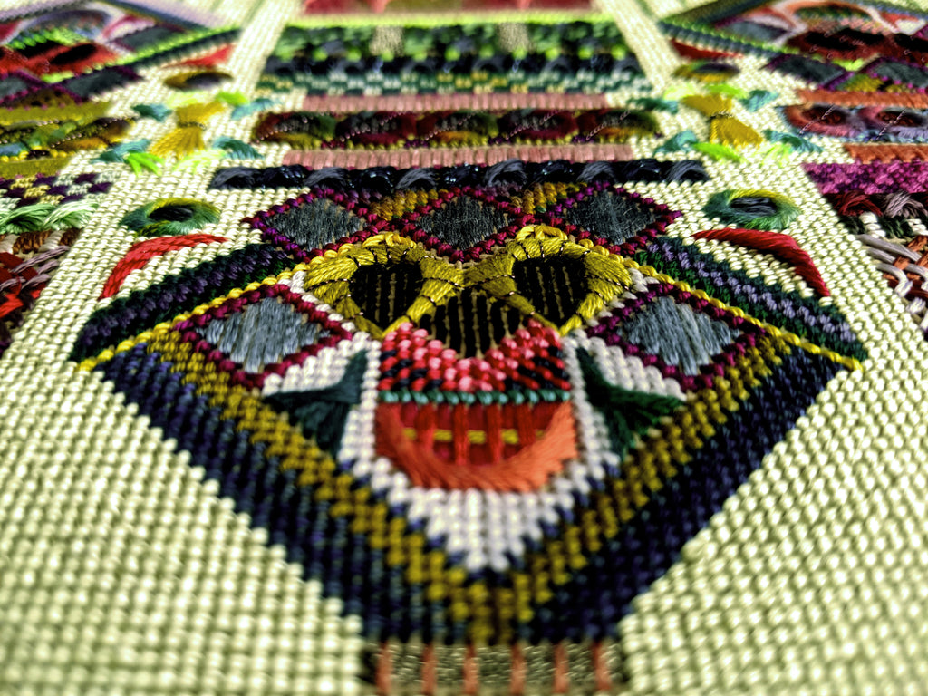 Orna recommends this project for intermediate stitchers and the ability to read charts is a must. This piece is stitched using more than 60 different threads, many of them being silk. The luscious threads have rich hues and they come to you from Gloriana (Princess Perle), Planet Earth, Access Commodities (Trebizond), Gumnuts (stranded silk), Stef Francis (stranded silk), Treenway Silks, and more! The colors are characteristic of Orna: bold and unique with dazzling combinations. Orna’s instruction guides are works of art in themselves. They are beautifully presented in color.