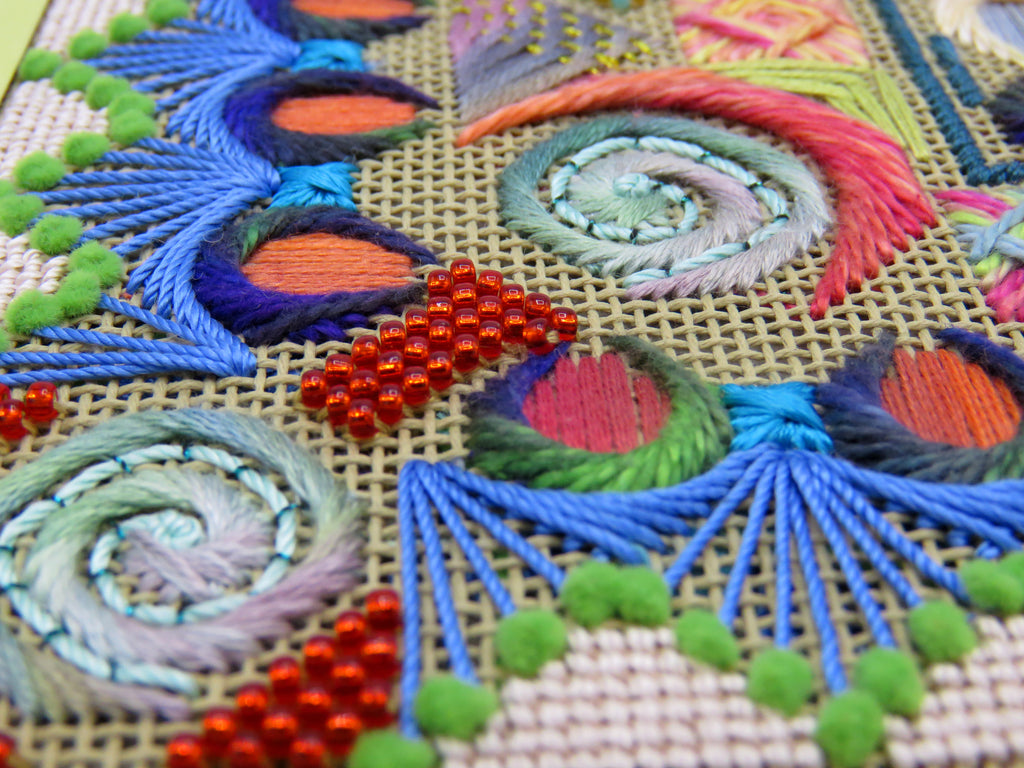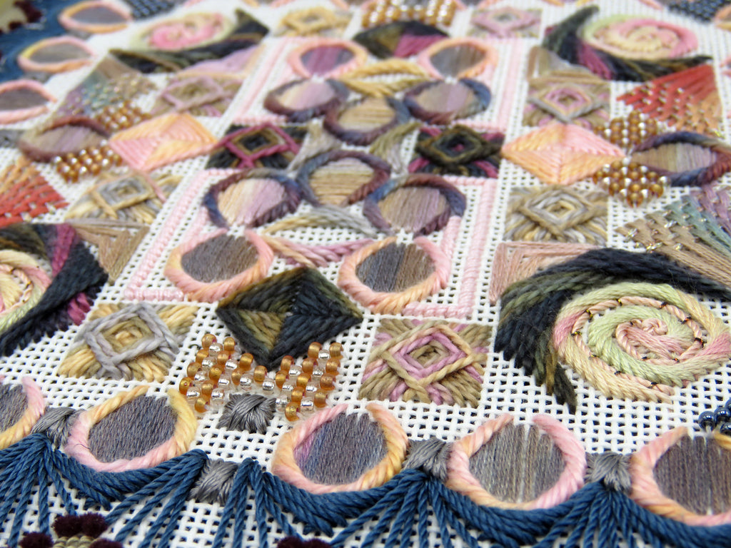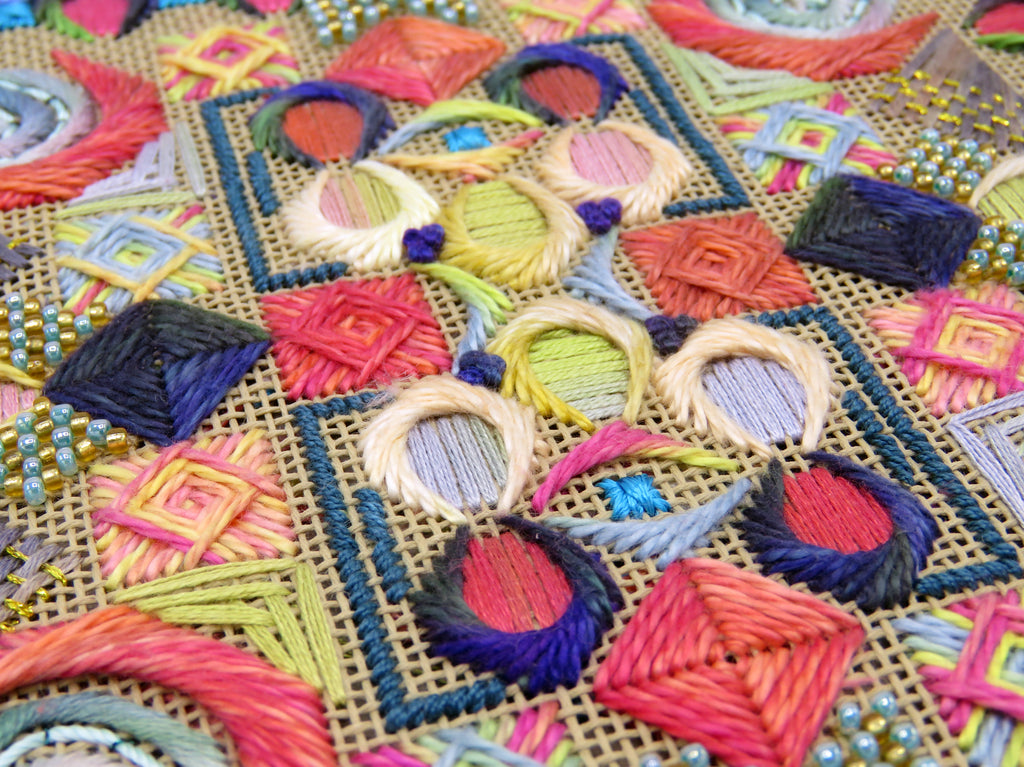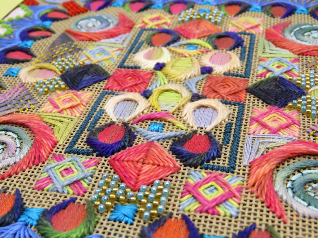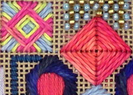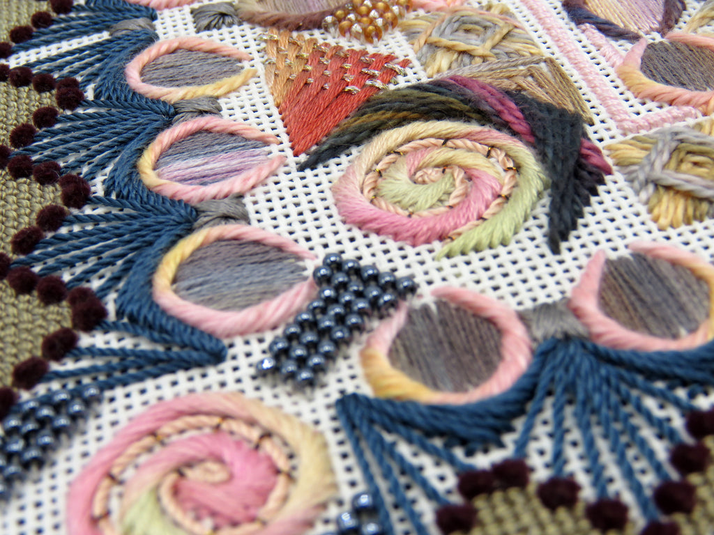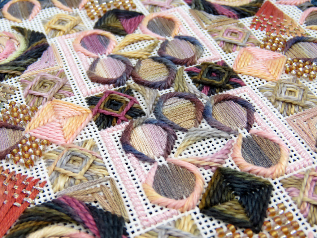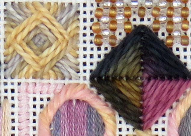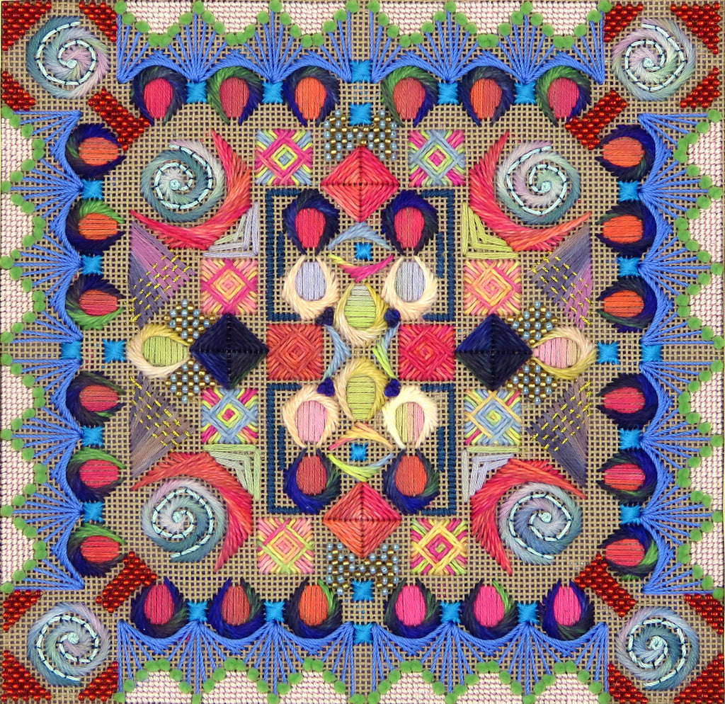 This design emphasizes intricate stitches such as Jessicas, Crescents and teardrop shapes. It also gives the stitcher a detailed look at manipulating overdye threads. The different threads used in the piece give the stitchers an opportunity to play with different textures and learn the peculiarities of each of the threads. The design comes in two colorways, one elegant and subdued and one for the daring bright color lovers.
