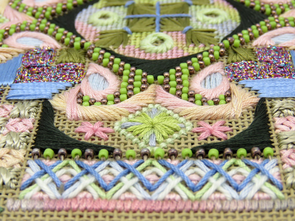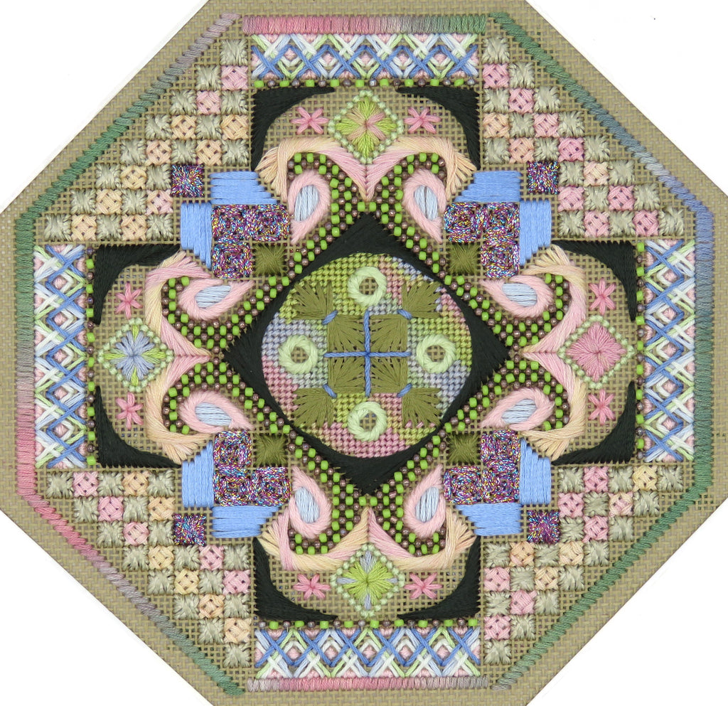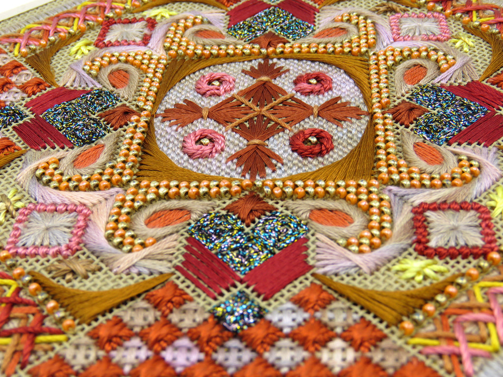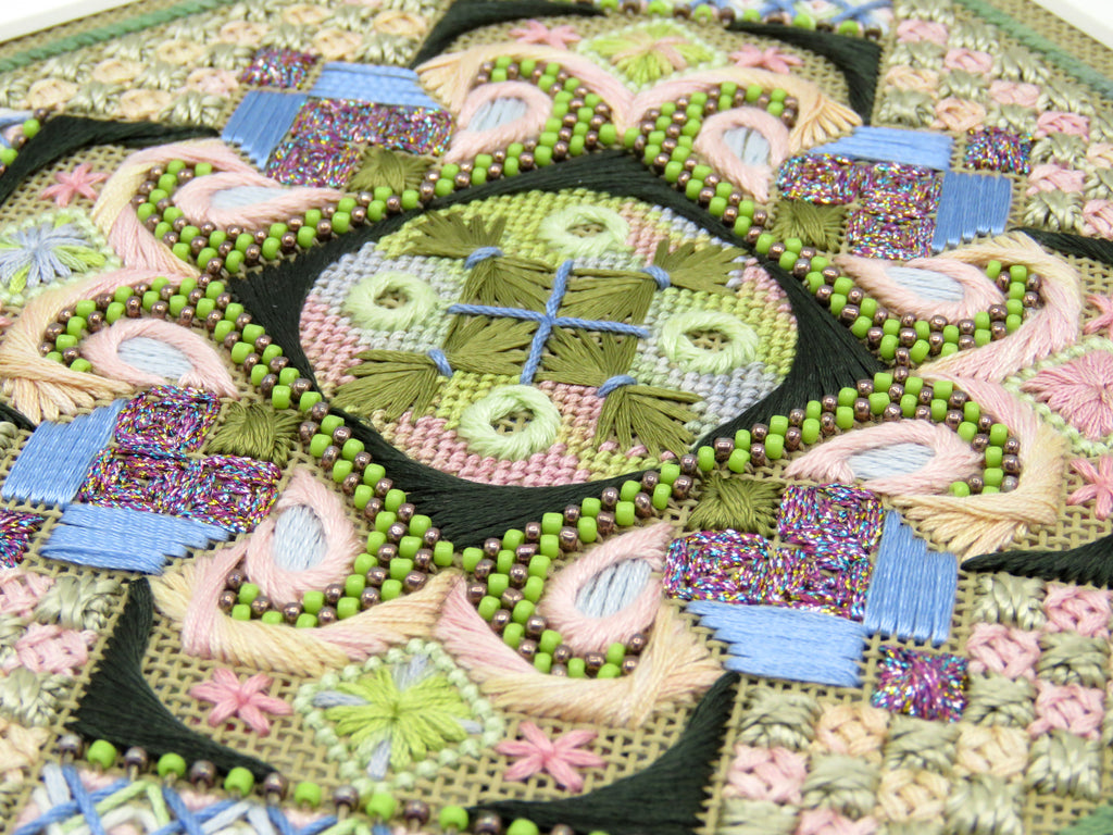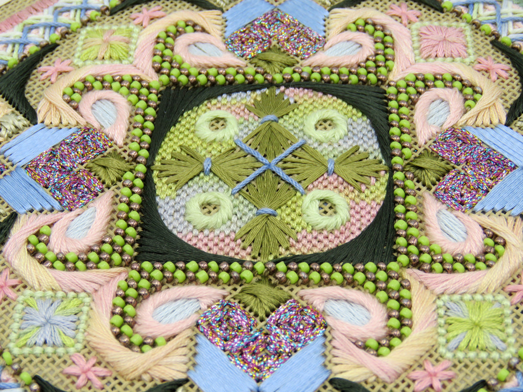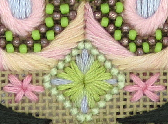 One of my vintage designs that has not lost it's charm. The interesting shape, the swirls of beads and stitched crescents, make this design unique and intriguing. It comes in two colorways; Spring, light and airy, Autumn, deep and warm. It is an interesting stitch, changing colors, stitches and techniques.