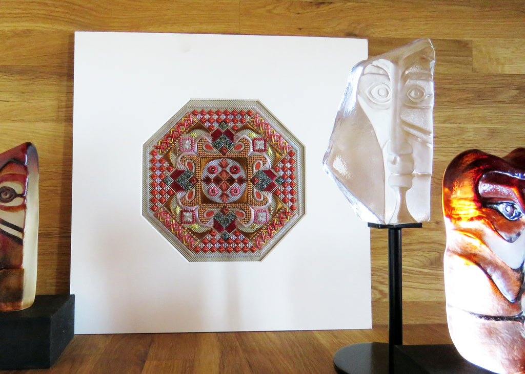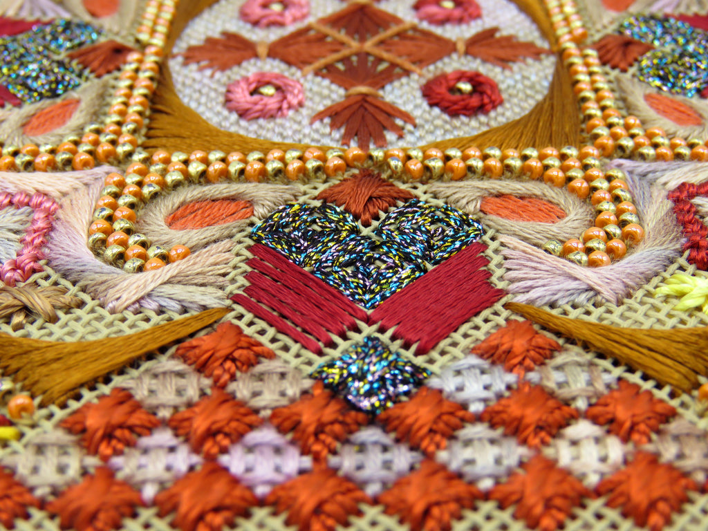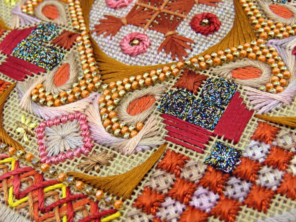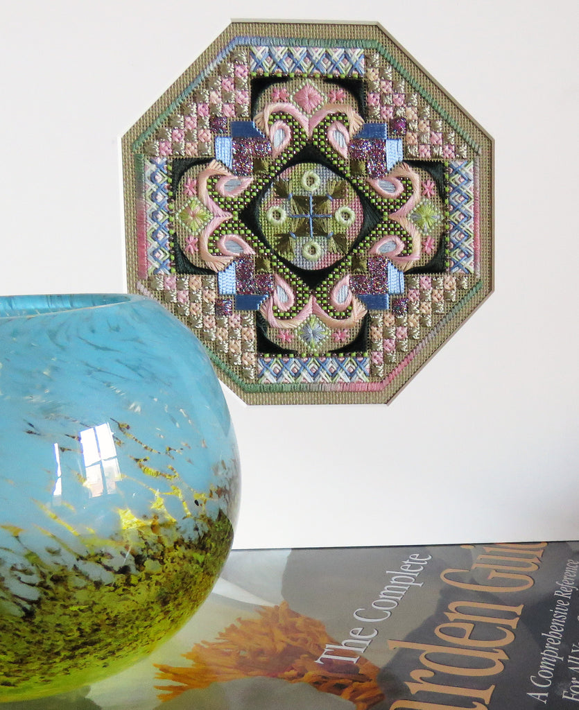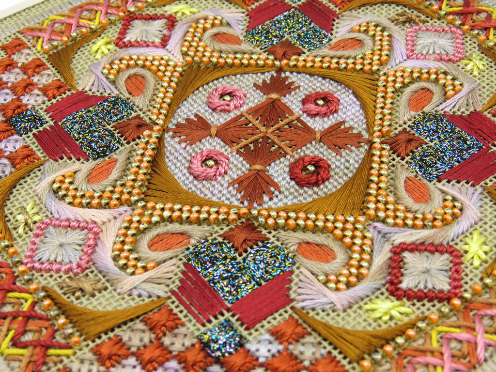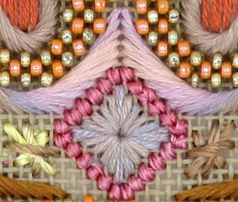 One of my vintage designs that has not lost it's charm. The interesting shape, the swirls of beads and stitched crescents, make this design unique and intriguing. It comes in two colorways; Spring, light and airy, Autumn, deep and warm. It is an interesting stitch, changing colors, stitches and techniques.