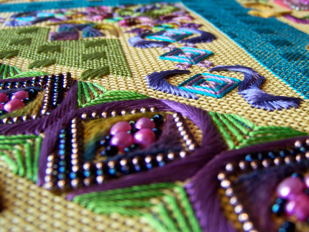 Sometimes a design is influenced by music and dance. The WINDOW IN THE OLD CITY series is just that. It is an interpretation of song and dance from cultures of the old world. The commonality in folk and gypsy music from Eastern Europe, the Far East, the Middle East and even Ireland is astounding. They all evoke swirls and spins, twirls and jumps. One can hear it in the melodies and voices of wonderful singers from all around the world. In this series the stitcher will hear it from the canvas. This is the first of the series. Use of embellishments such as glass beads and fresh water pearls makes the most of the canvas.
