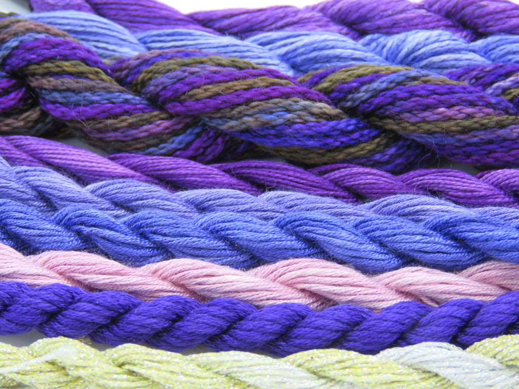Silk and cotton hand dyed threads for needlepoint and embroidery. Assortment of light pale yellows, greens and blushes are coordinated for an interesting way to work your fiber pieces. These are the top fibers on the market. Also included metallic hand dyed fibers. Ready to use in any needlepoint or embroidery project. 6 SILK skeins, 2 OVERDYE COTTON skeins and one METALLIC skein coordinated for your use.