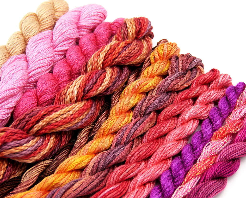 Silk and cotton hand dyed threads for needlepoint and embroidery. Assortment of light pale yellows, greens and blushes are coordinated for an interesting way to work your fiber pieces. These are the top fibers on the market. Also included metallic hand dyed fibers. Ready to use in any needlepoint or embroidery project. 6 SILK skeins, 2 OVERDYE COTTON skeins and one METALLIC skein coordinated for your use.