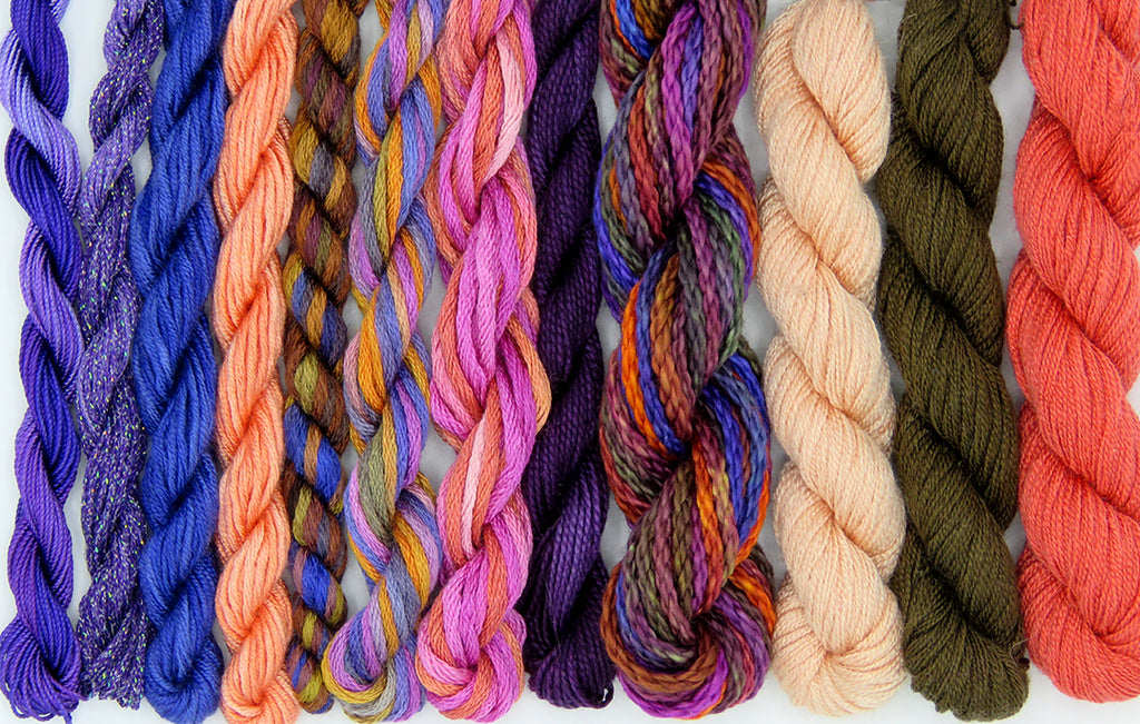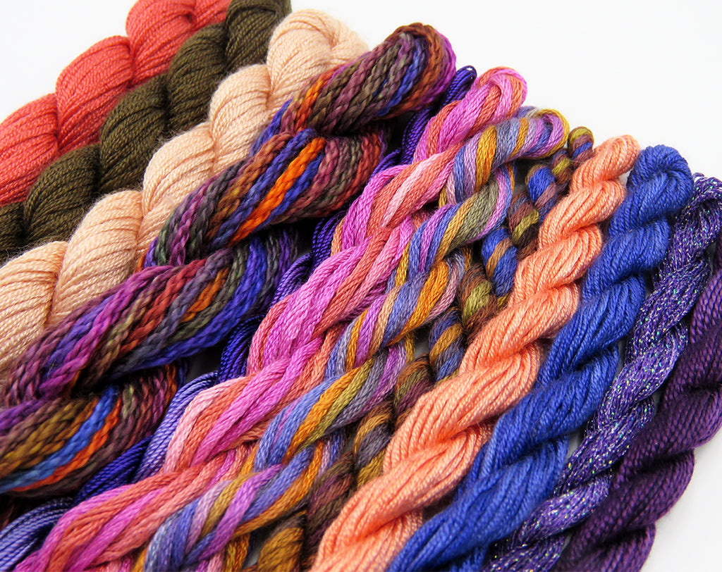 Silk and cotton hand dyed threads for needlepoint and embroidery. Assortment of light pale yellows, greens and blushes are coordinated for an interesting way to work your fiber pieces. These are the top fibers on the market. Also included metallic hand dyed fibers. Ready to use in any needlepoint or embroidery project. 6 SILK skeins, 2 OVERDYE COTTON skeins and one METALLIC skein coordinated for your use.