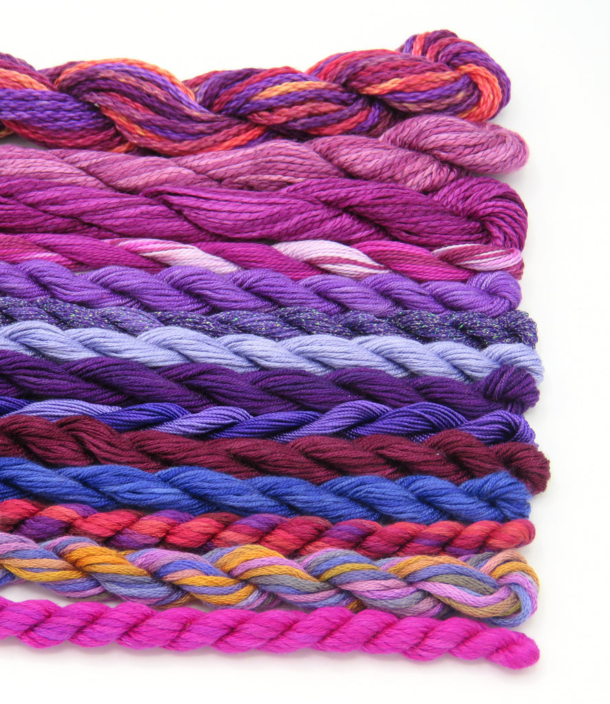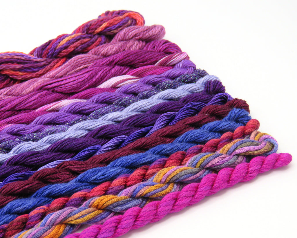 14 skeins of beautiful silks, overdyes and metallics. This is a beautiful assortment that gives you a great sampling of the extraordinary threads available today.